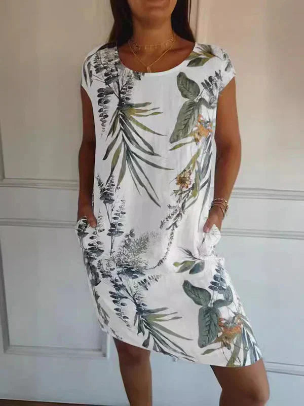 🌷SIDSTE DAGS SALG 49% RABATT🍀Kjole med botanisk trykk og rund hals for kvinner